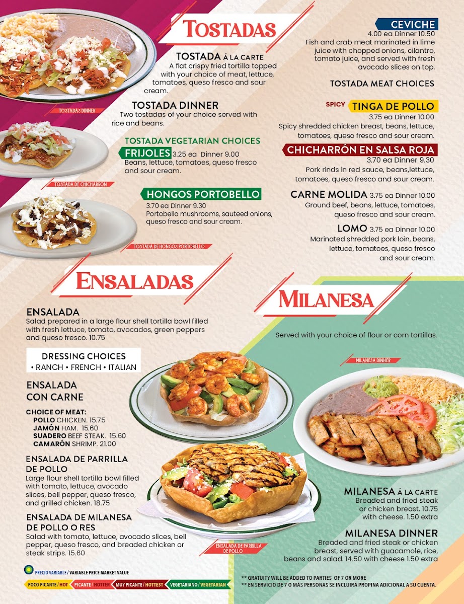 For something crispy and satisfying, don't miss their tostadas, which are topped with a robust selection of fresh ingredients like portobello mushrooms, marinated shredded pork, or tinga. Each bite is refreshing and hearty, available at $3.75 each or as a dinner for a truly satisfying meal. And for those evenings when you're in the mood for something a bit more indulgent, opt for the chimichangas at $5.25 a la carte or $13.00 as a dinner—the perfect comfort food that promises a delectable crunch.